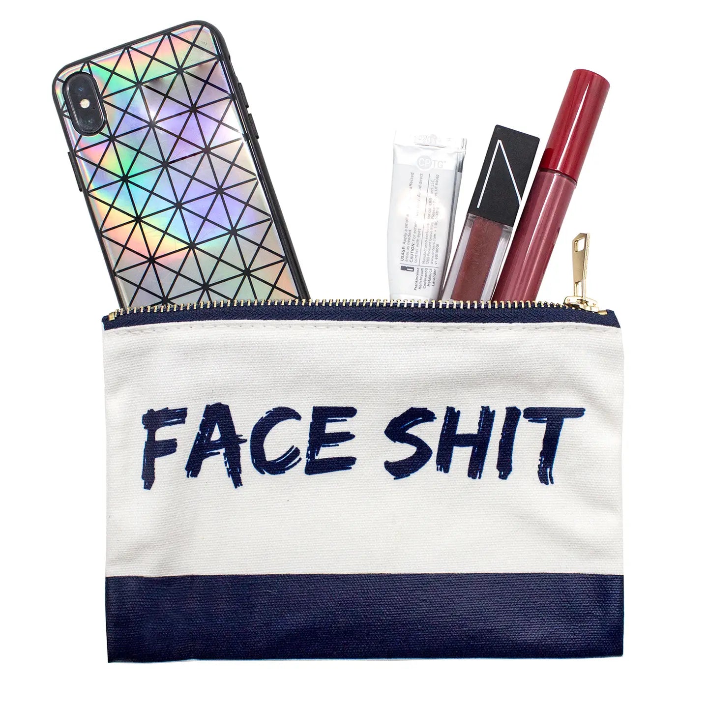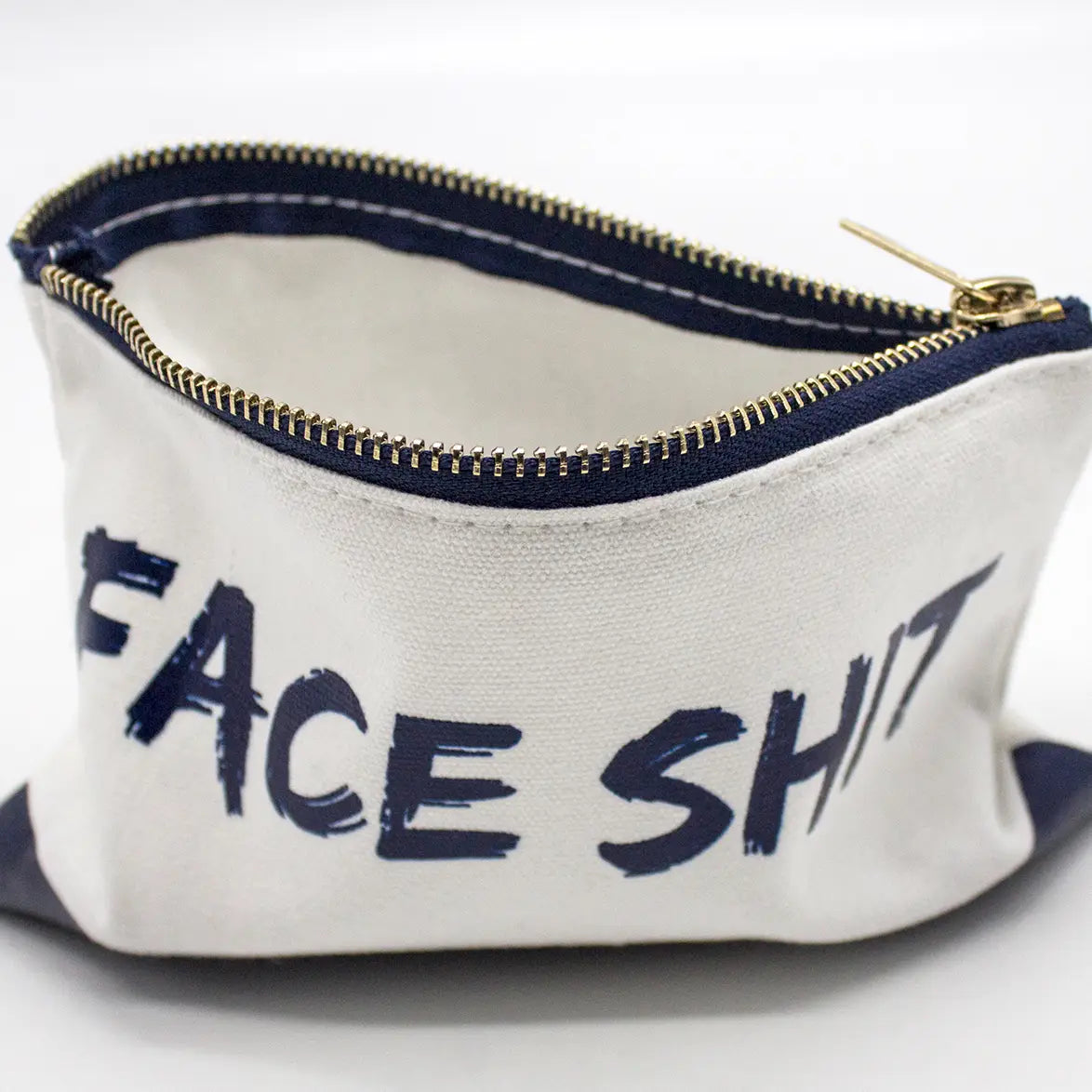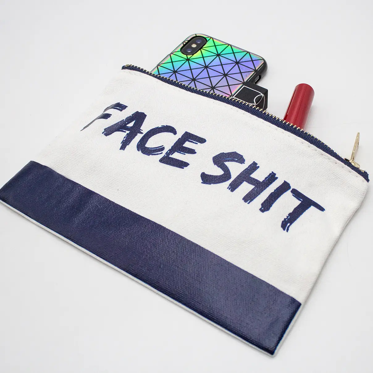 Keep your makeup in this cheeky and functional makeup bag! Perfect size for your purse, for an overnight trip, and/or your most essential items! This envelope-style small navy blue canvas bag with polyester lining and shiny gold zipper closure, lettering is in white, perfect for holding cosmetics, cell phones, cards, pens, keys, purses, make-up, and just general accessories. Approx. 8" W x 5.5" L. Made of cotton.