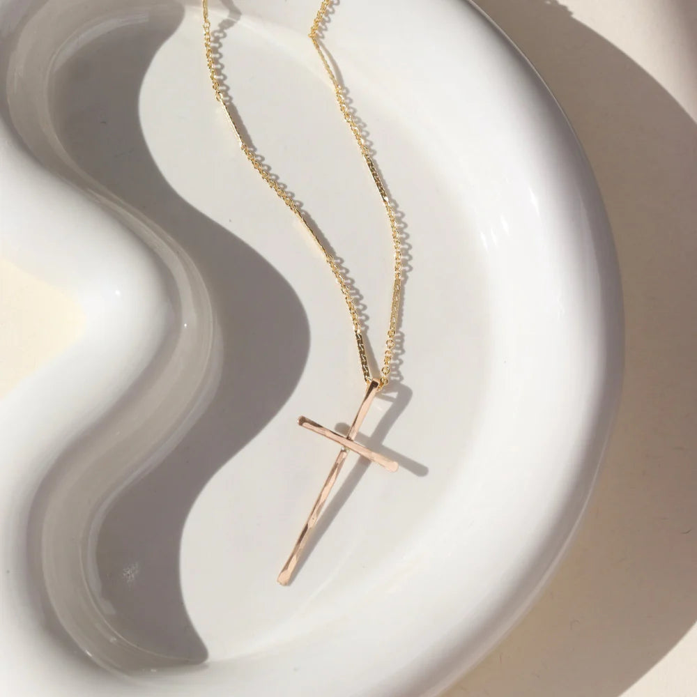 Designed to captivate, this statement necklace features an elongated Sailor Chain paired with a hand-hammered cross pendant. The delicate profile of our best-selling chain highlights the bold texture of the pendant, creating a modern piece with timeless appeal.