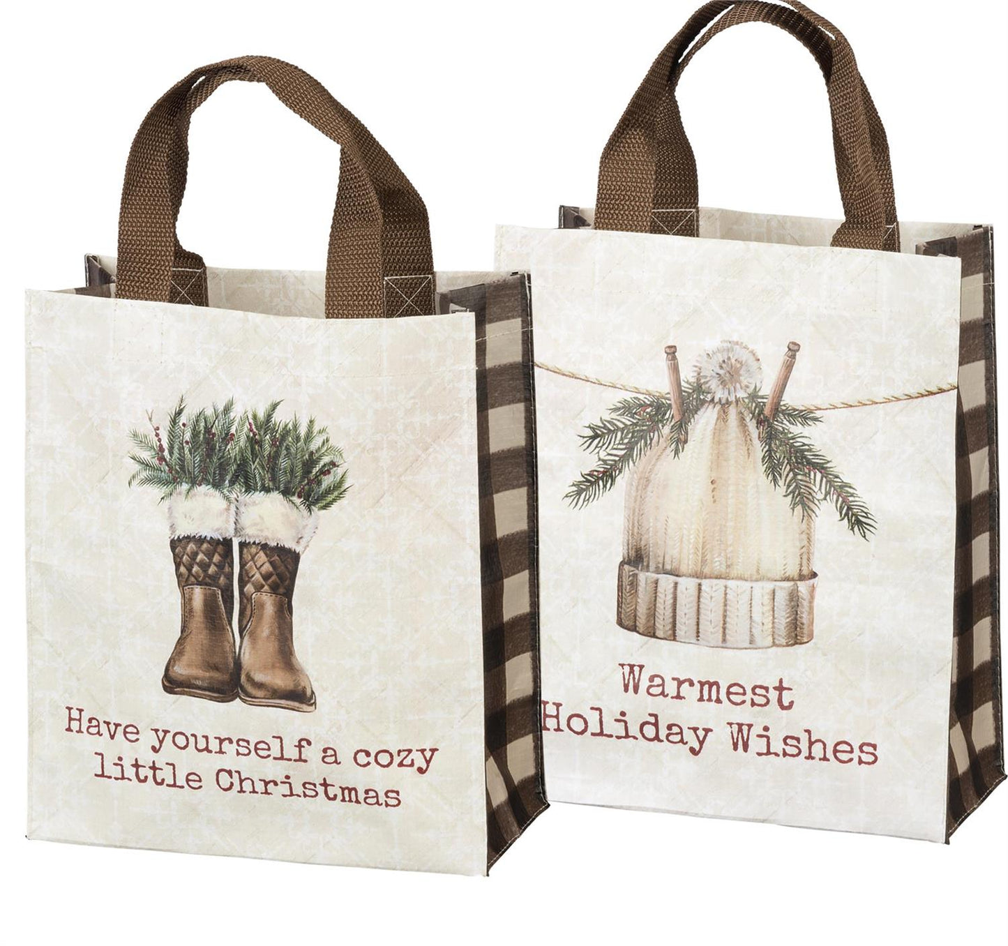Bring festive charm to your everyday carry with our double-sided daily tote bag from the Christmas Collection. One side features a "Warmest Holiday Wishes" sentiment with cozy beanie and bristled branch illustrations, while the reverse showcases "Have Yourself A Cozy Little Christmas" alongside boots and matching branch accents. Gingham print panels add a classic holiday touch.