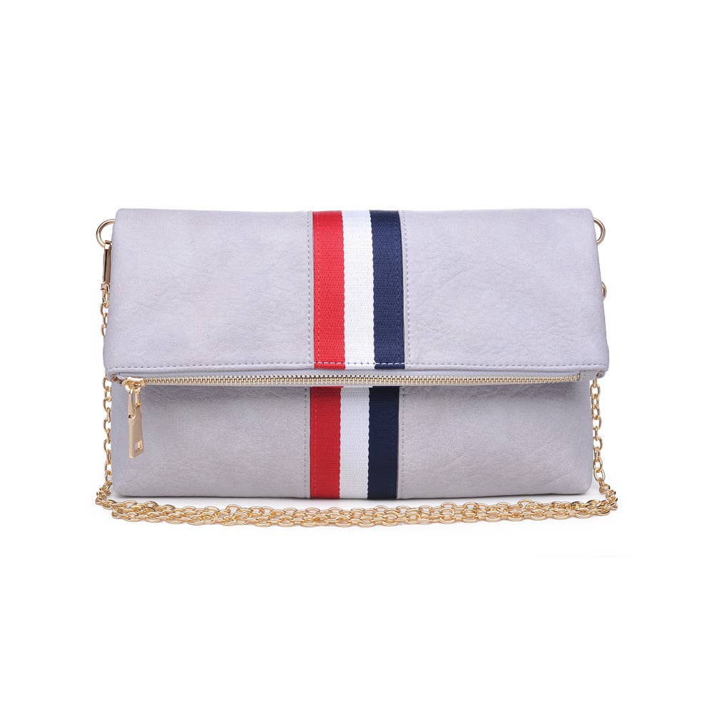 Exterior Details: Center stripe, fold-over clutch, 1 zipper pocket