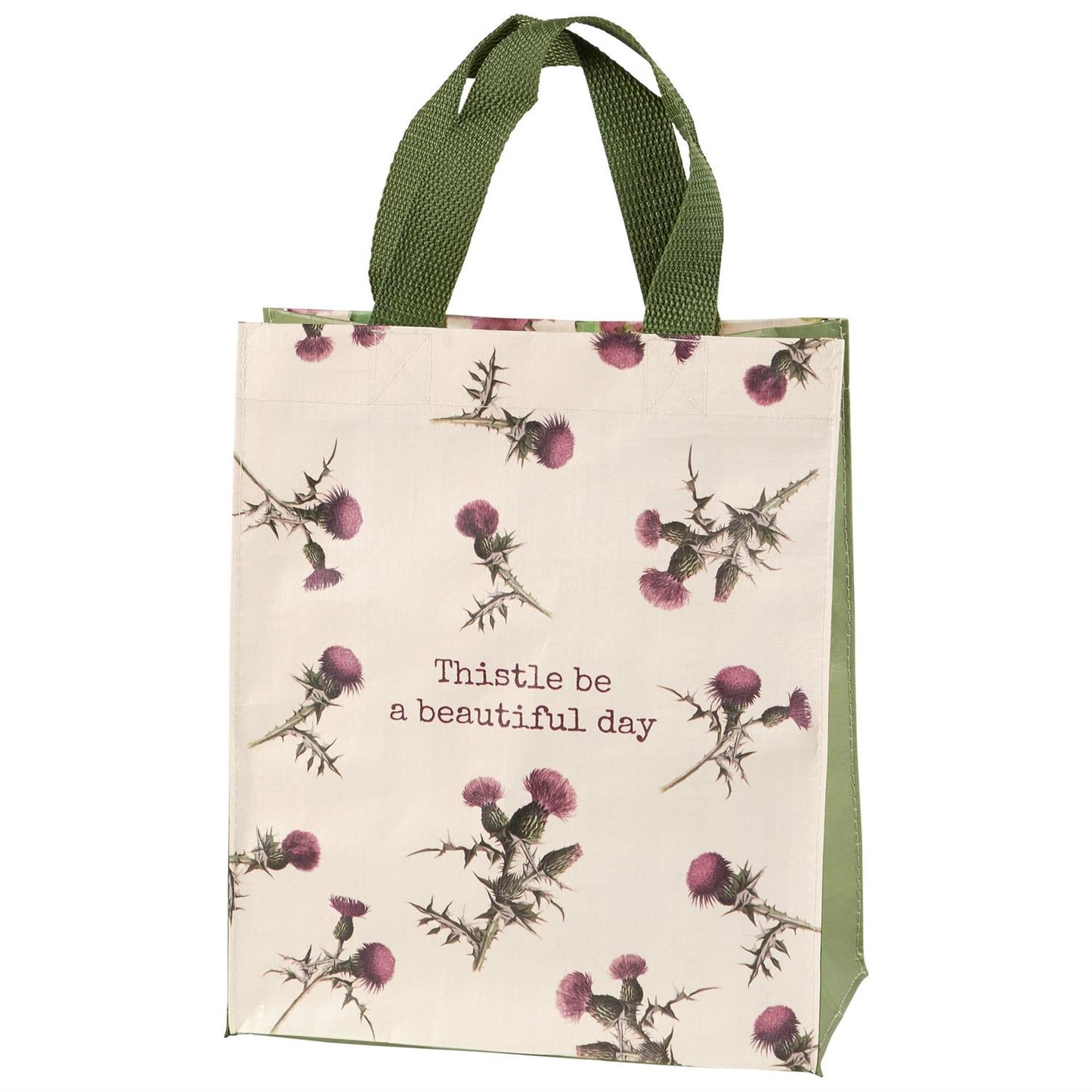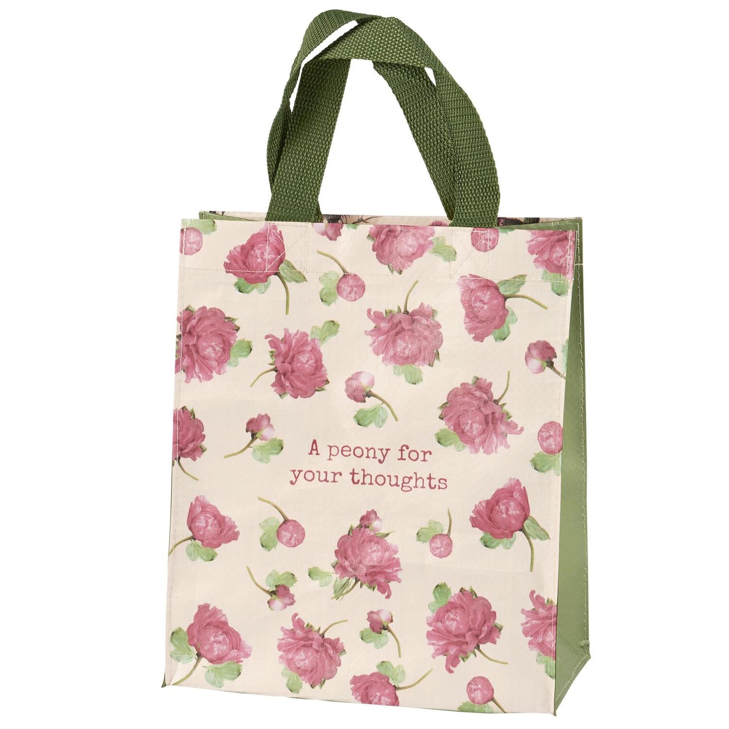 A double-sided daily tote displaying vintage art of flowers with coordinating pun sentiments. Designs include thistles with "Thistle Be A Beautiful Day" sentiment on one side and peonies with "A Peony For Your Thoughts" on the other side. Gussets feature a coordinating green color. Our Peony tote bag is made from eco-friendly post-consumer material and includes complementing green nylon straps. Tote folds flat for convenient storage. A fun garden-themed accessory perfect for everyday use.