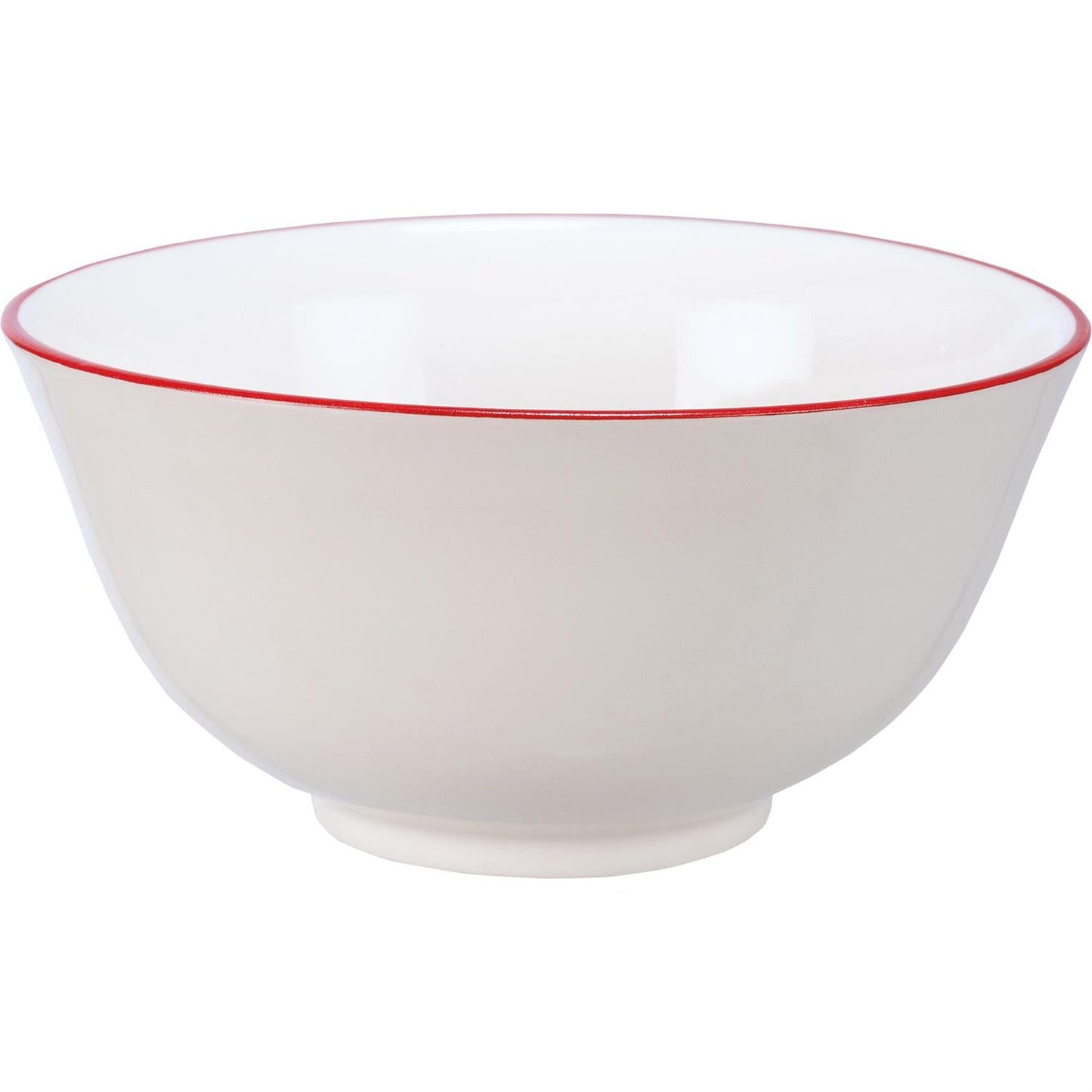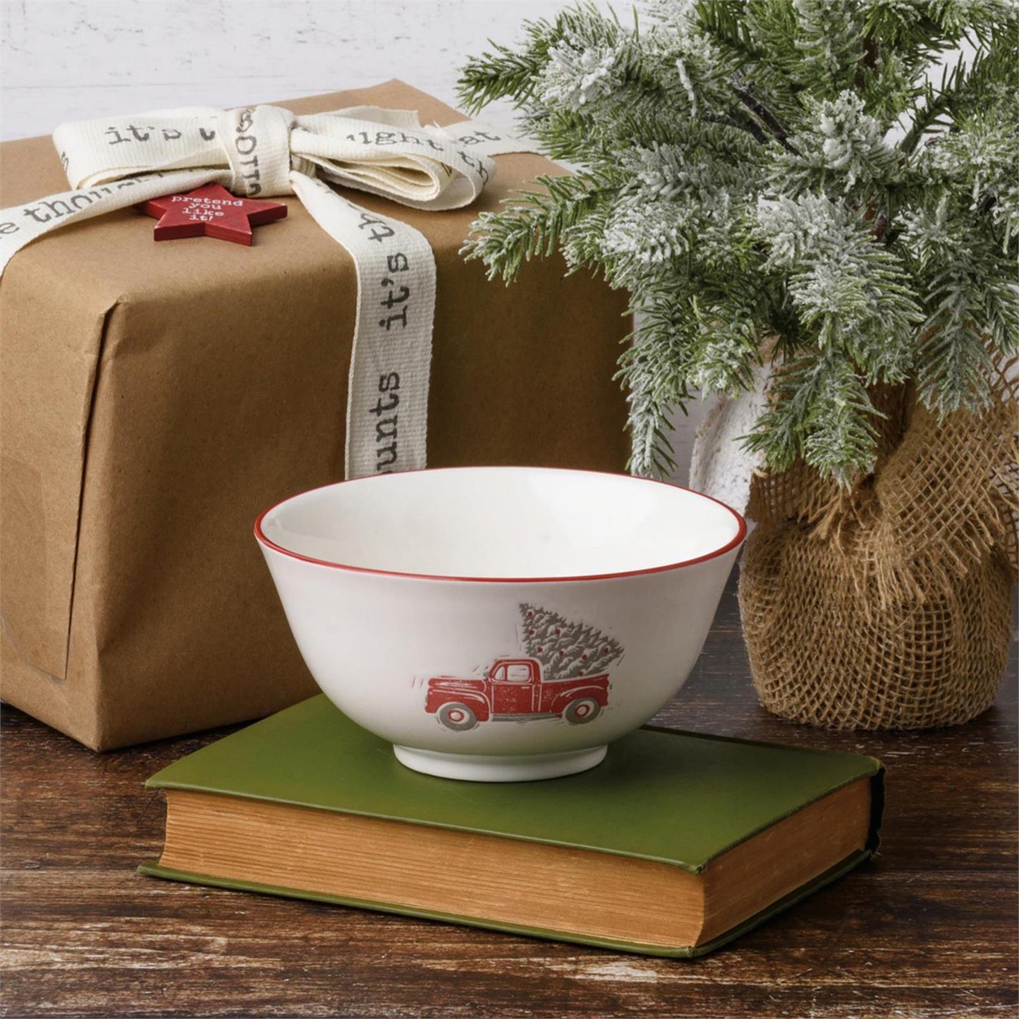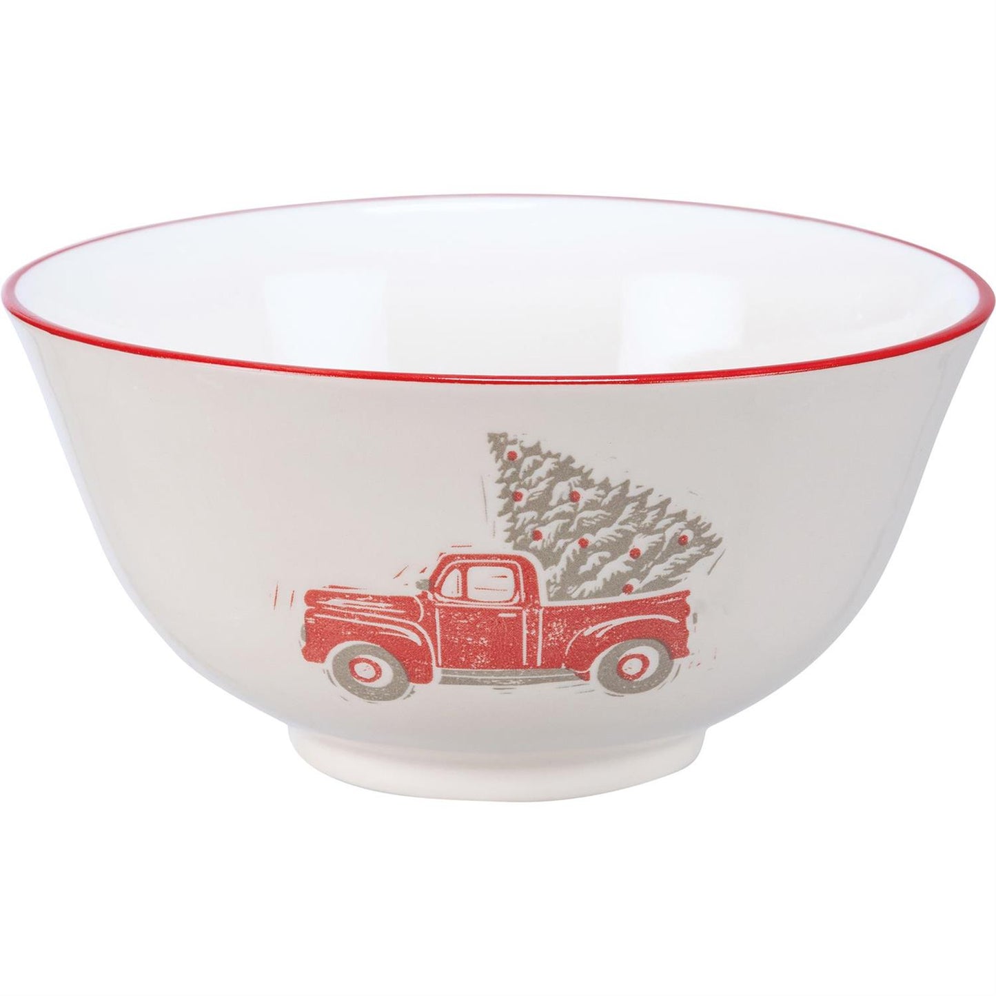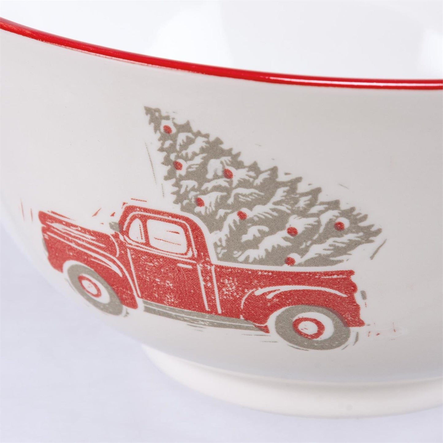 A stoneware bowl featuring a red truck and Christmas tree design with debossed details. Red rim adds interest to design. Red truck bowl is microwave, dishwasher, and food safe