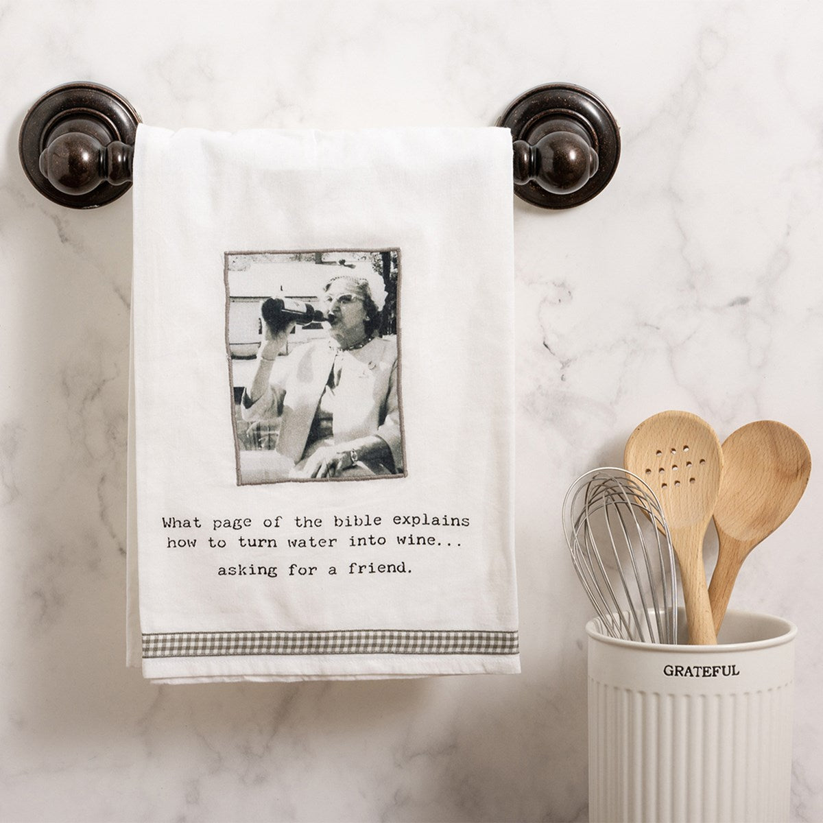 Regular price $7.50Add a playful touch to your kitchen with our "Into Wine" stitched art kitchen towel. Featuring a vintage photograph and the humorous sentiment, "What Page Of The Bible Explains How To Turn Water Into Wine…Asking For A Friend," this towel brings charm and wit to your home. The design is framed with a gingham ribbon trim for a cozy, rustic feel.