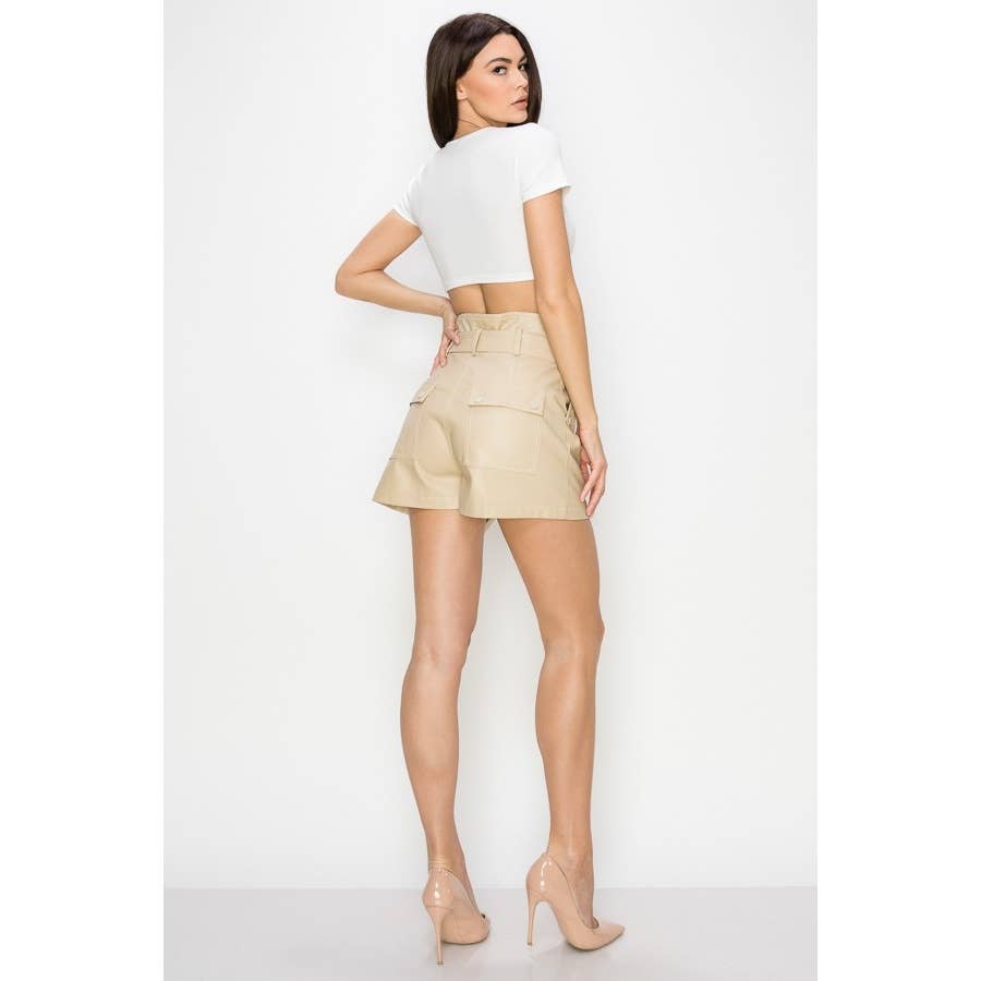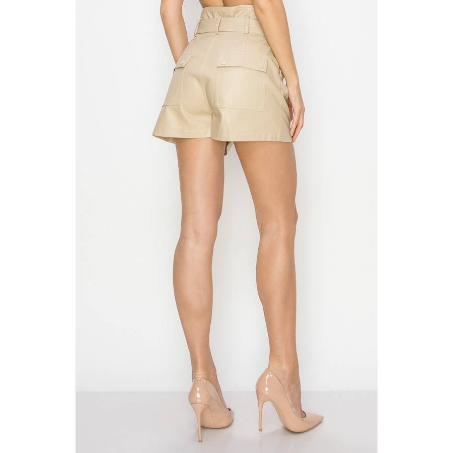 High Waist Belt Tie Side Pocket Leather Short Pants