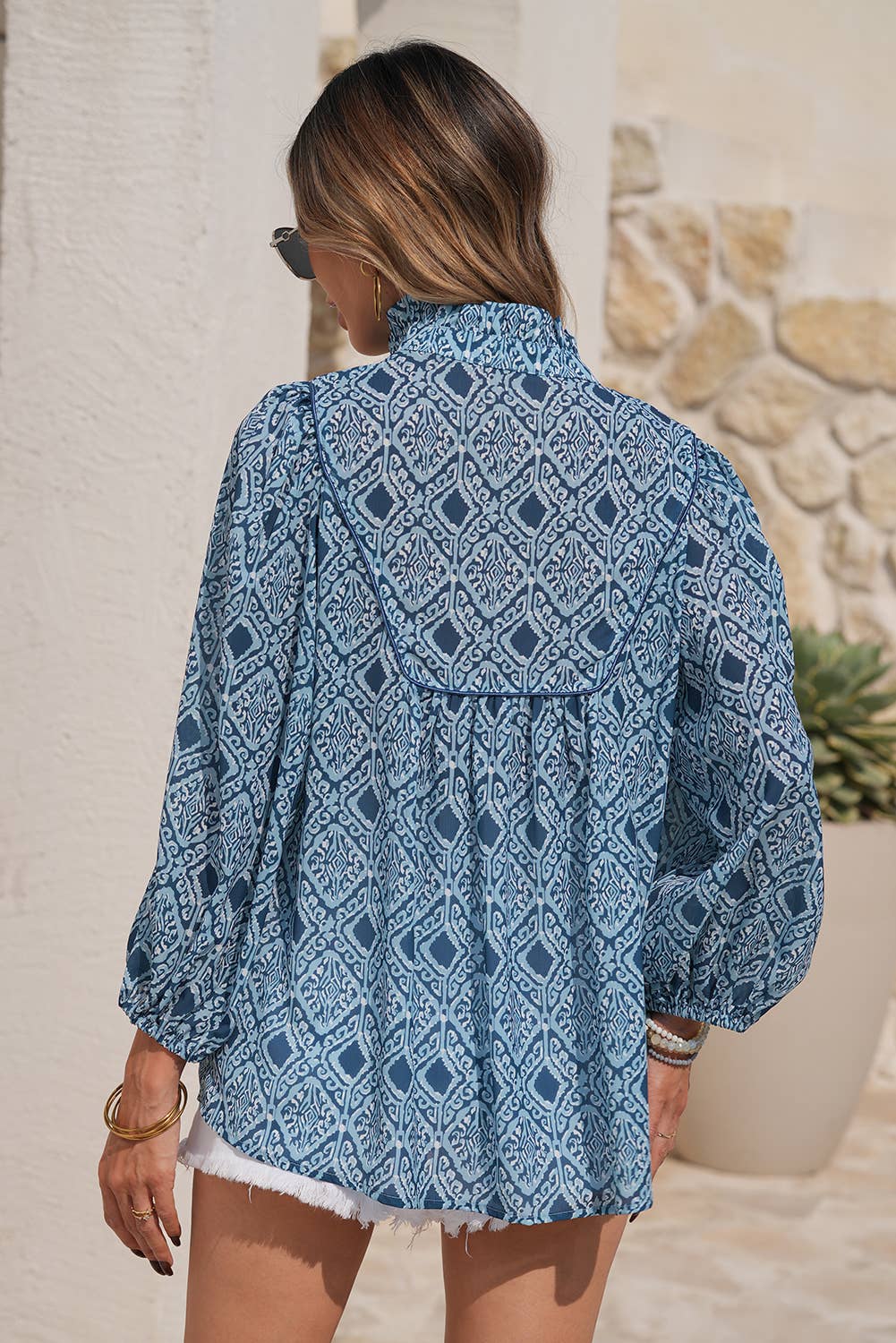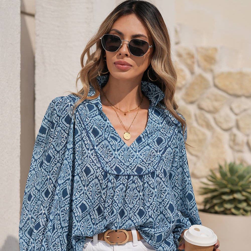Western Geometric Print Frilled V Neck Loose Fit Blouse