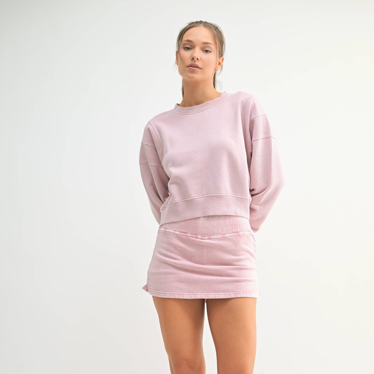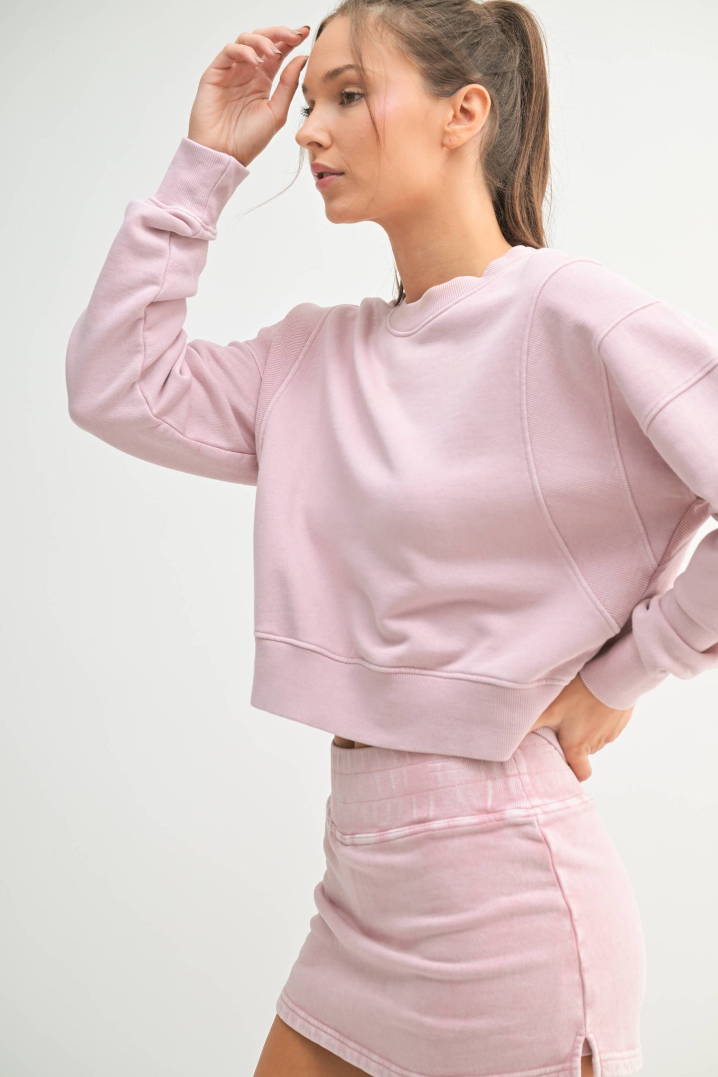 Elevate your casual wardrobe with the Mineral Wash Cropped Sweatshirt. Made from soft cotton fleece, this standout piece features ribbed contrast armhole panels and a wide ribbed waistband for a comfortable, flattering fit. The crewneck design and cropped length create a chic silhouette, while the mineral wash gives each sweatshirt a one-of-a-kind look and feel.
