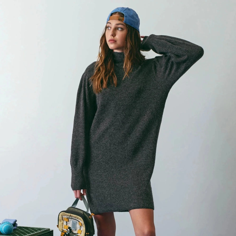 This chic mini sweater dress combines modern design with cozy comfort. Featuring a flattering mock neck and long sleeves, the ruched shoulder detail adds a touch of sophistication and texture. Crafted from a soft, sustainable blend of recycled polyester, wool, and a hint of spandex for added stretch, this dress is perfect for cooler weather and effortlessly transitions from day to night.