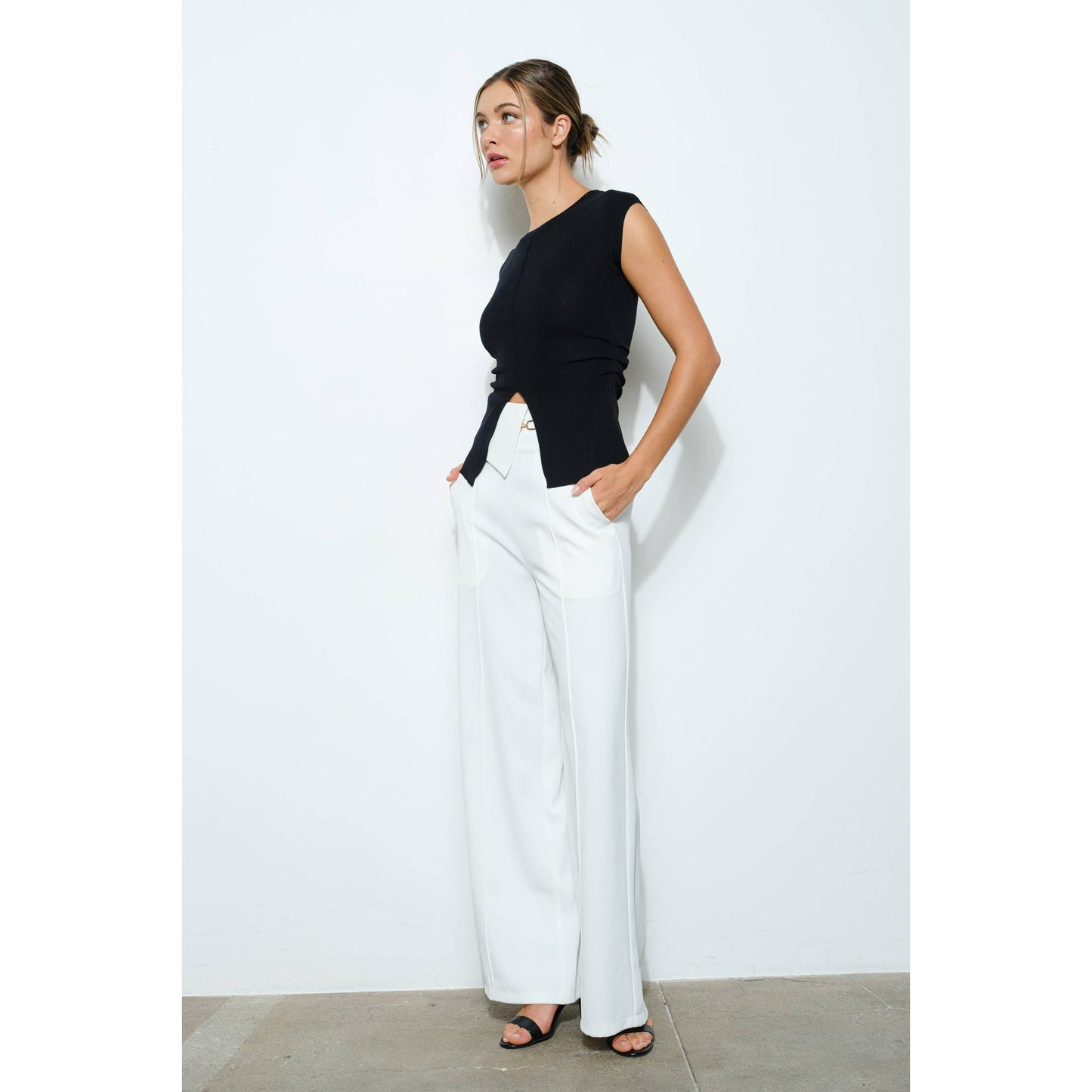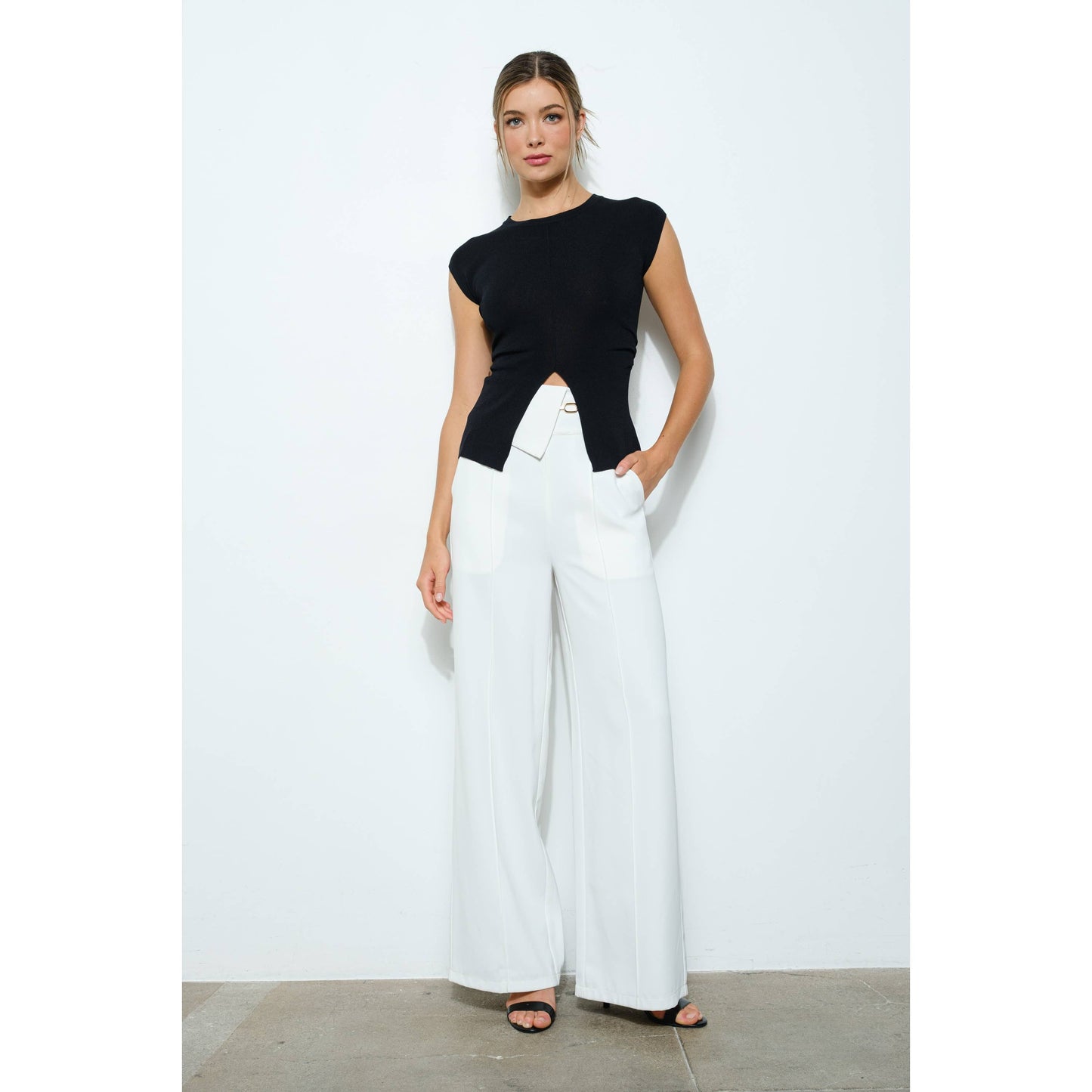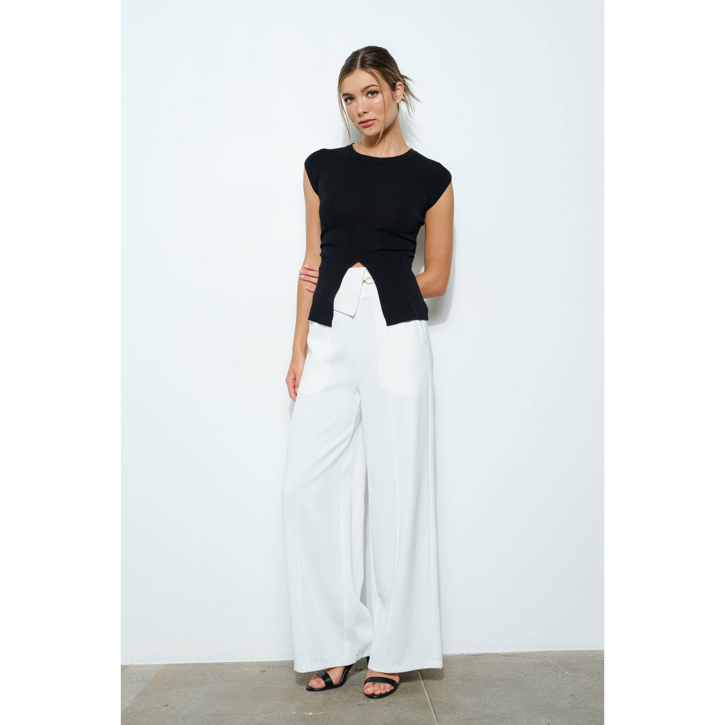 Elevate your wardrobe with this effortlessly chic knit top. Featuring a classic round neckline and cap sleeves, this piece is designed with a front slit for a touch of modern flair. The ruched waist detail adds shape and definition, flattering the silhouette while offering comfort and style.